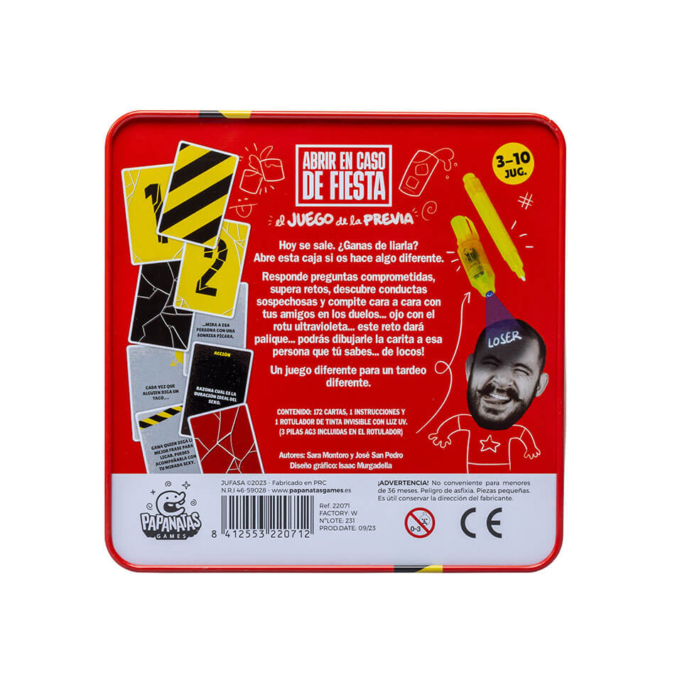 Responde preguntas comprometidas, supera retos, descubre conductas sospechosas y compite cara a cara con tus amigos en los duelos… ojo con el marcador ultravioleta… este reto dará de que hablar… podrás dibujarle la carita a esa persona que tú sabes… de locos!