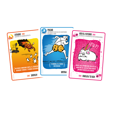 Cómo jugar: los jugadores roban cartas hasta que alguien robe al EXPLODING KITTEN momento en el que EXPLOTA y PIERDE LA PARTIDA. A NO SER que pueda desactivar al gato con cosas como un puntero láser o frotándole la barriga. Usa cartas de acción para pasar tu turno, para mirar en secreto una carta antes de robarla o para forzar a tu oponente a robar en vez de robar tú.