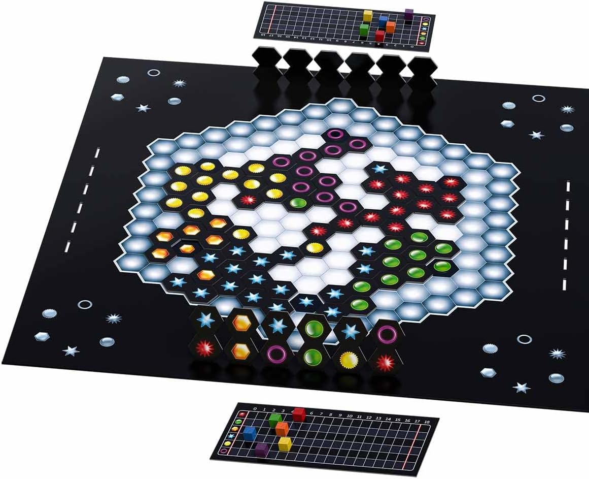 El juego consta de tres componentes: un tablero ampliable, un marcador de puntuación con peones y 120 piezas hexagonales dobles con símbolos y colores. Al comenzar, cada jugador pone sus seis contadores en el primer casillero de su marcador de puntuación y roba seis piezas dobles al azar. En cada turno irá ubicando sus piezas sobre el tablero de tal manera que uno de sus símbolos coincida con el de otra pieza formando filas de símbolos en distintas direcciones, las que le otorgarán un determinado puntaje dependiendo de la cantidad de espacios que ocupe cada fila dentro del tablero. De acuerdo a esto, el jugador podrá avanzar en su marcador de puntuación el peón del color respectivo a la fila de símbolos recién creada, tantos lugares como puntos haya obtenido en la jugada. Cuando el tablero no tenga más espacios vacíos el juego concluirá, el ganador será quien tenga más puntaje, para definir el puntaje de los jugadores sólo se considerara el contador con menos puntaje, por lo cual avanzar con todos los colores es fundamental, de lo contrario perderás rápidamente.