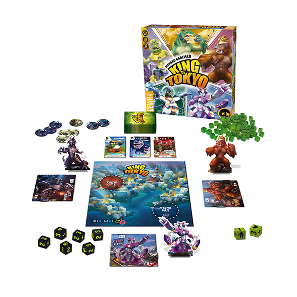 Una serie de monstruos mutantes, robots gigantes y extraños extraterrestres están peleando a la mitad de Tokyo y destruyendo la ciudad en el proceso ¿tu misión es detenerlos? ¡No! ¡En King of Tokyo tú eres una de esas gigantescas criaturas y lo que quieres es derrotar a los demás para proclamarte rey de la ciudad!