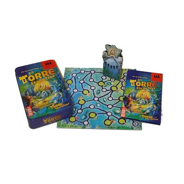 Esta versión de La Torre Encantada viene en una pequeña lata de metal que simplifica algunos de los componentes del juego original, pero mantiene toda la diversión y emoción a la que estamos acostumbrados.
