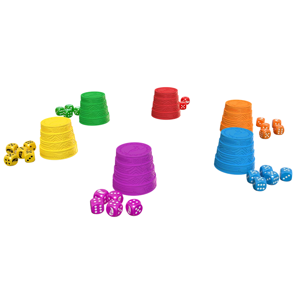 30 dados (5 de cada color), 6 cubiletes (1 de cada color), 1 bolsa, 1 tapa, 1 reglamento.