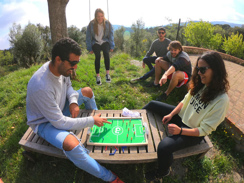 Empieza chutando: Tras un sorteo inicial, uno de los jugadores dará el primer golpe a la pelota con el dedo, intentando marcar el primer gol. ¡Que comience la emoción!