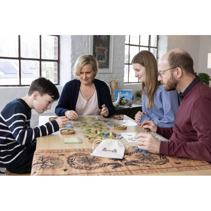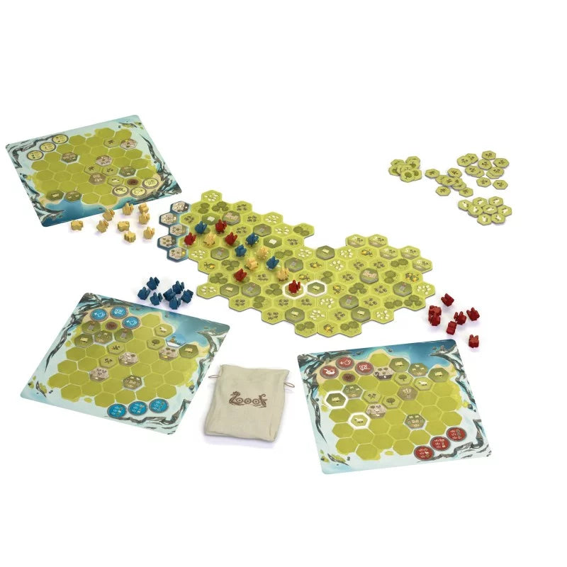 - En el tablero común: Los jugadores son vikingos conquistando un nuevo territorio, lo que les permite recuperar fichas de recursos, edificios u objetivos.